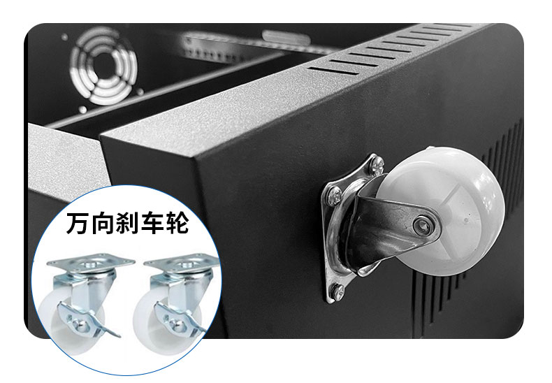 機柜配有靜音萬向輪承重力強,含2個剎車輪,整體更穩定360°移動無死角
